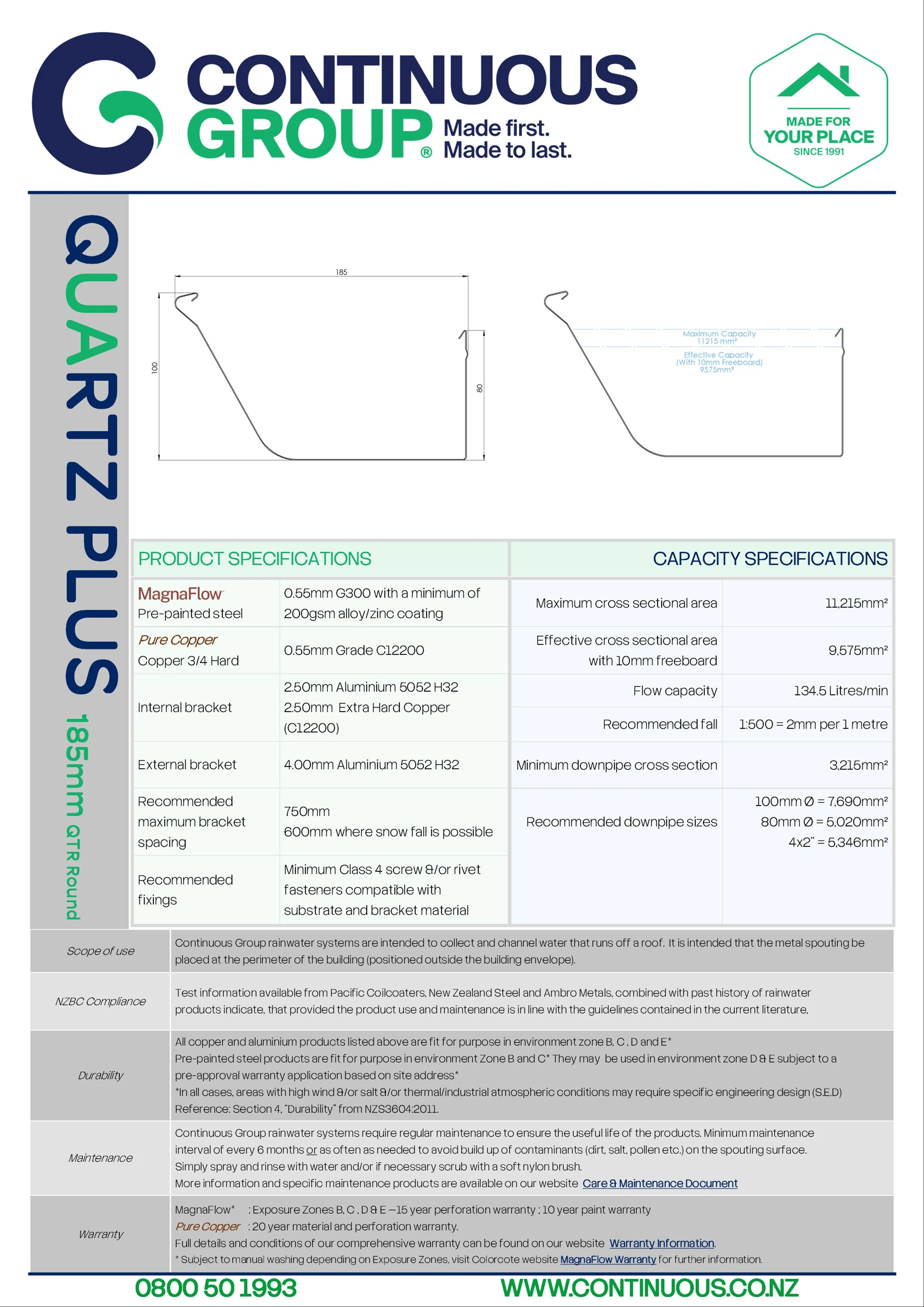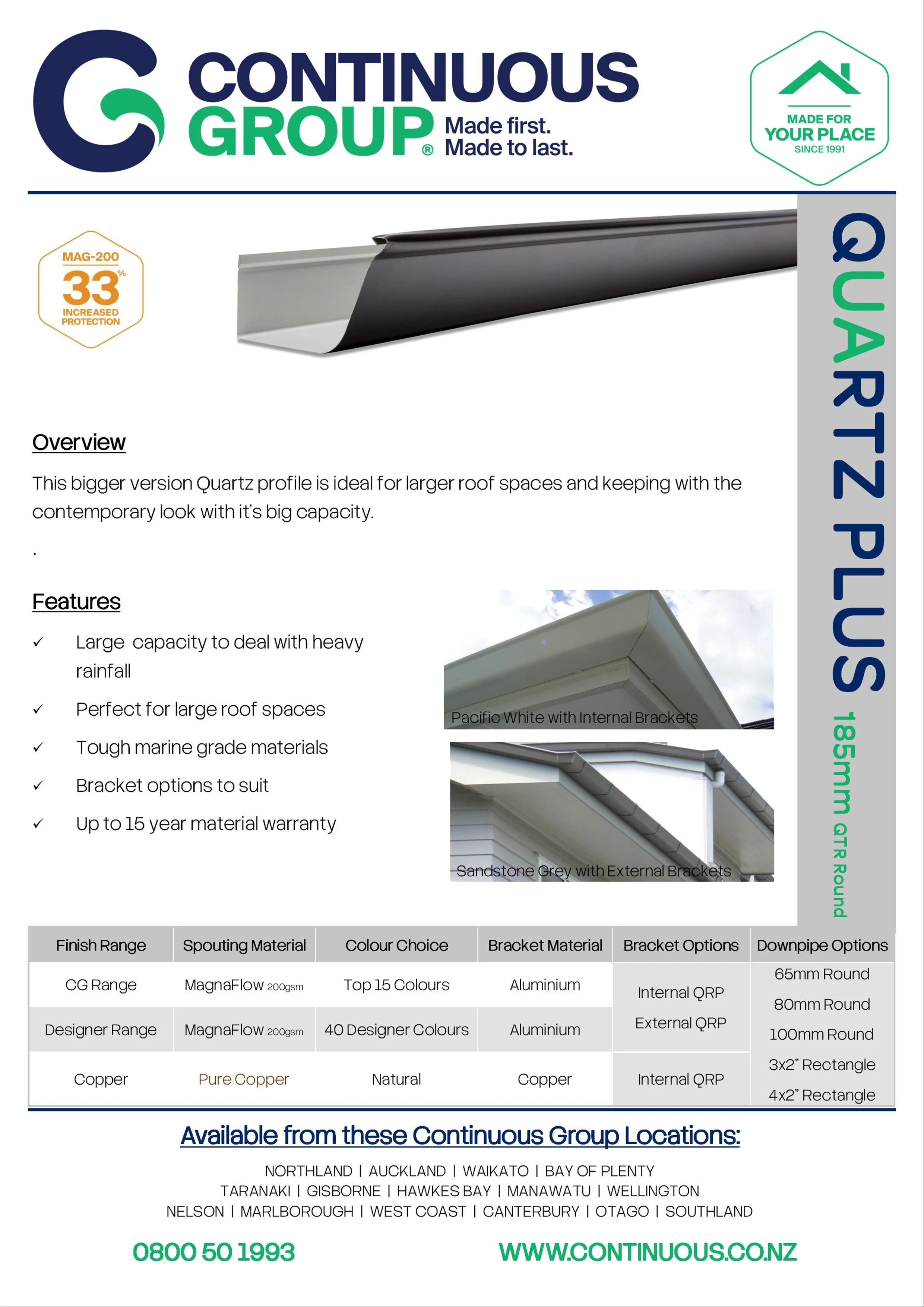 Our Quartz Plus profile provides a contemporary design that offers large capacity for those that have super heavy rainfalls. It is very popular on both new builds and when replacing spouting on kiwi homes. Quartz Plus provides great roof edge coverage and, at 185mm wide, also offers great access for cleaning with a standard roof overhang.